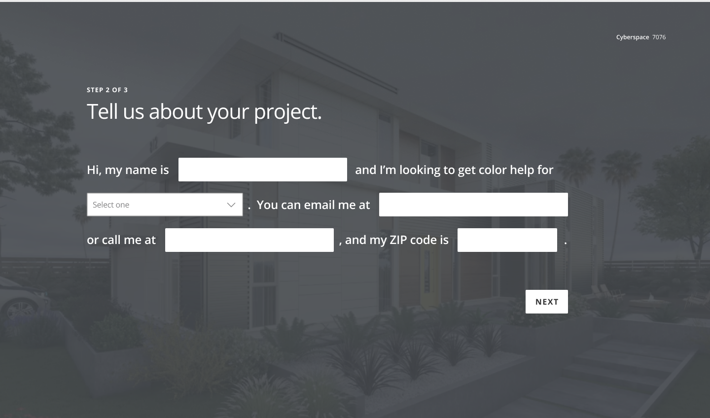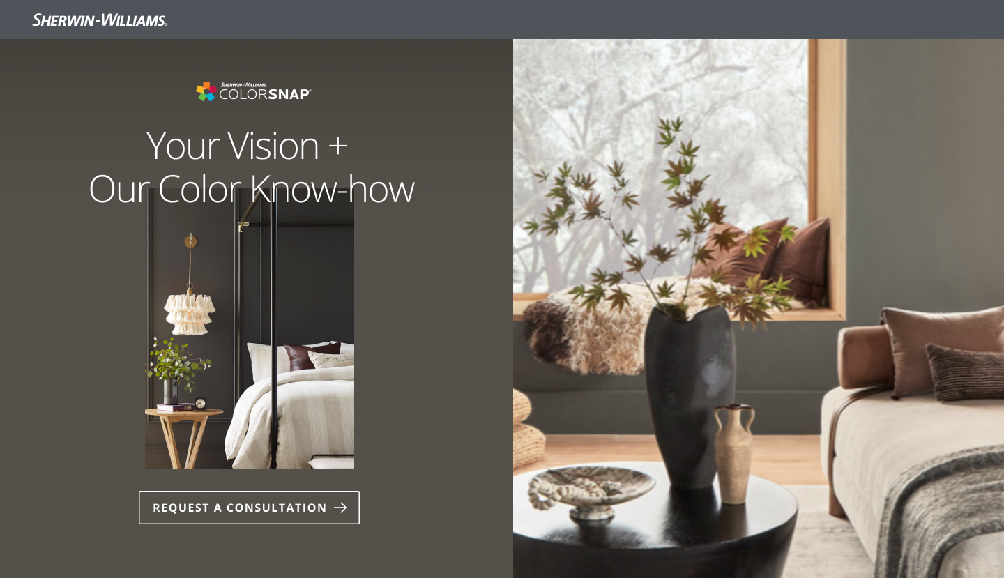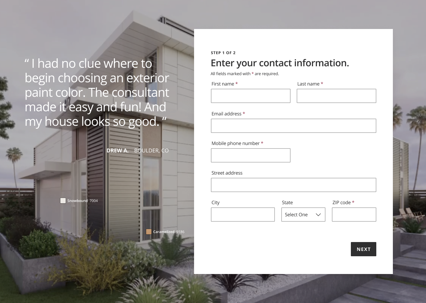 Iterated versions of the hero, consultation details, request form, customer testimonials, and color consultant sections. We featured S-W’s Color of the Year as potential inspiration.