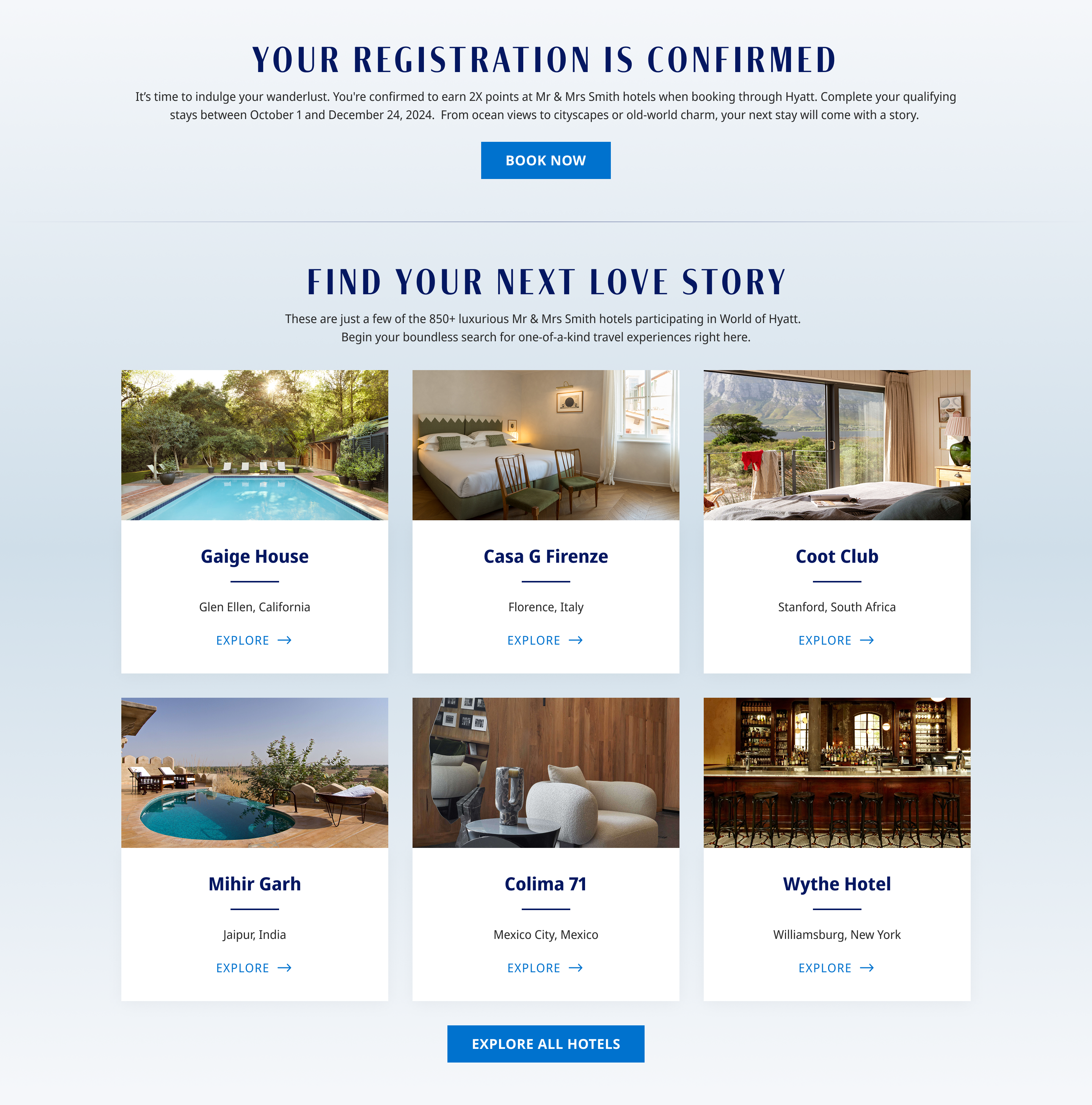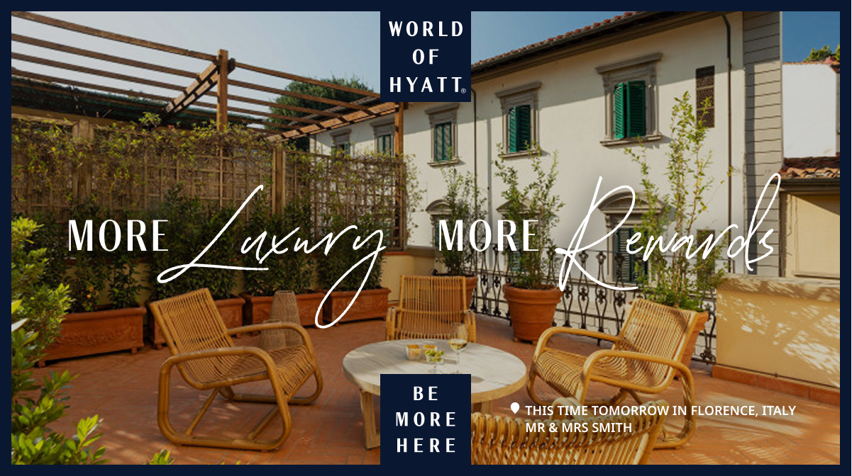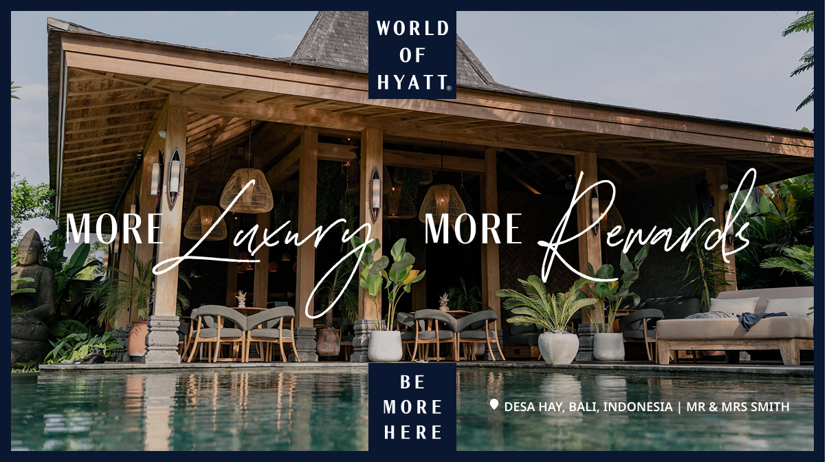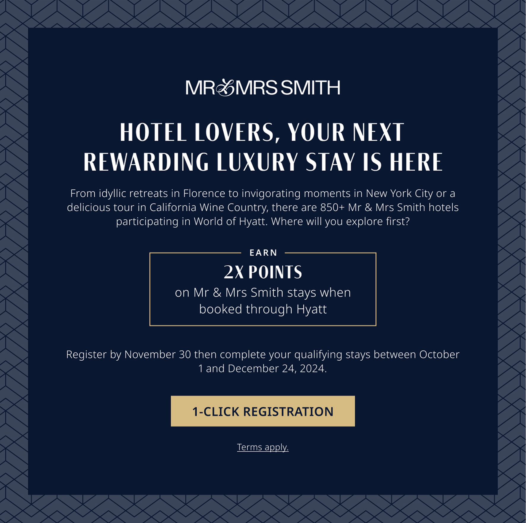 Mr & Mrs Smith is a curated collection of luxurious, boutique hotels and villas. With more than 850 MMS hotels now participating in World of Hyatt, members can earn rewards and benefits in some of the most distinctive destinations across the globe when booking through Hyatt.