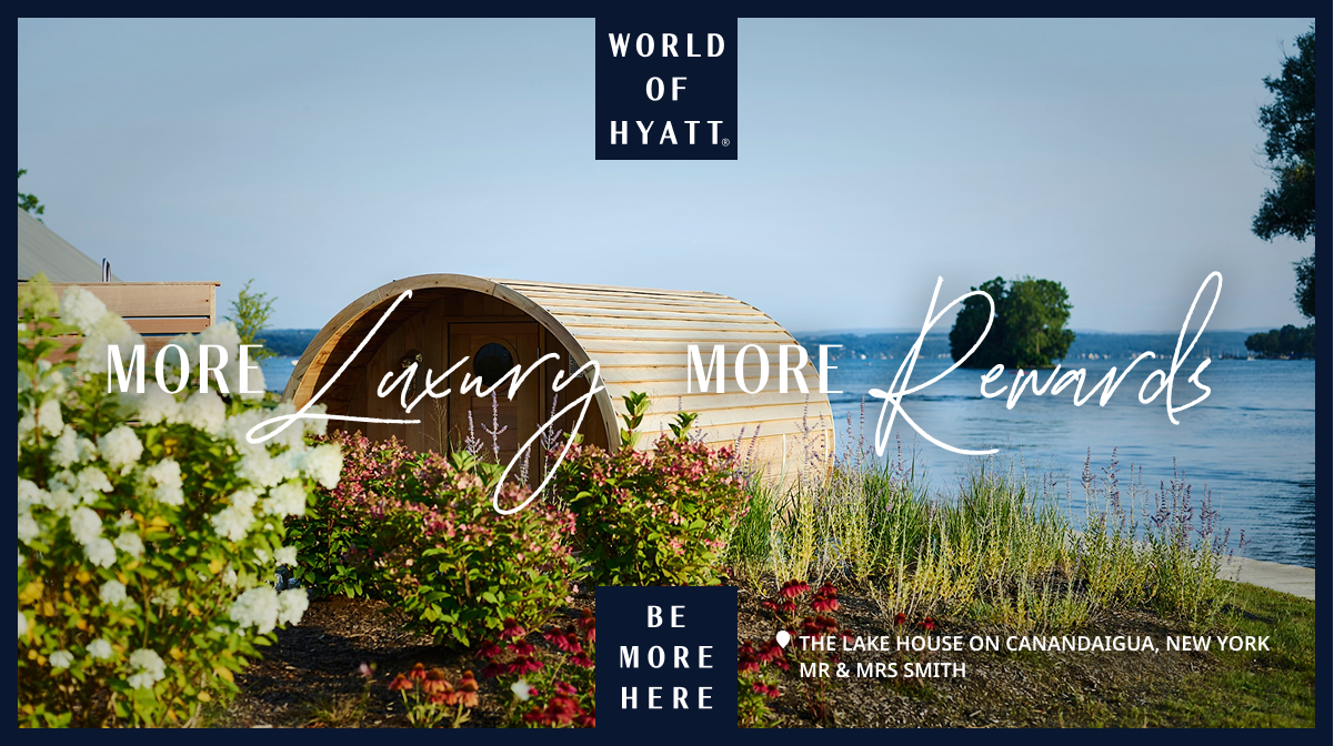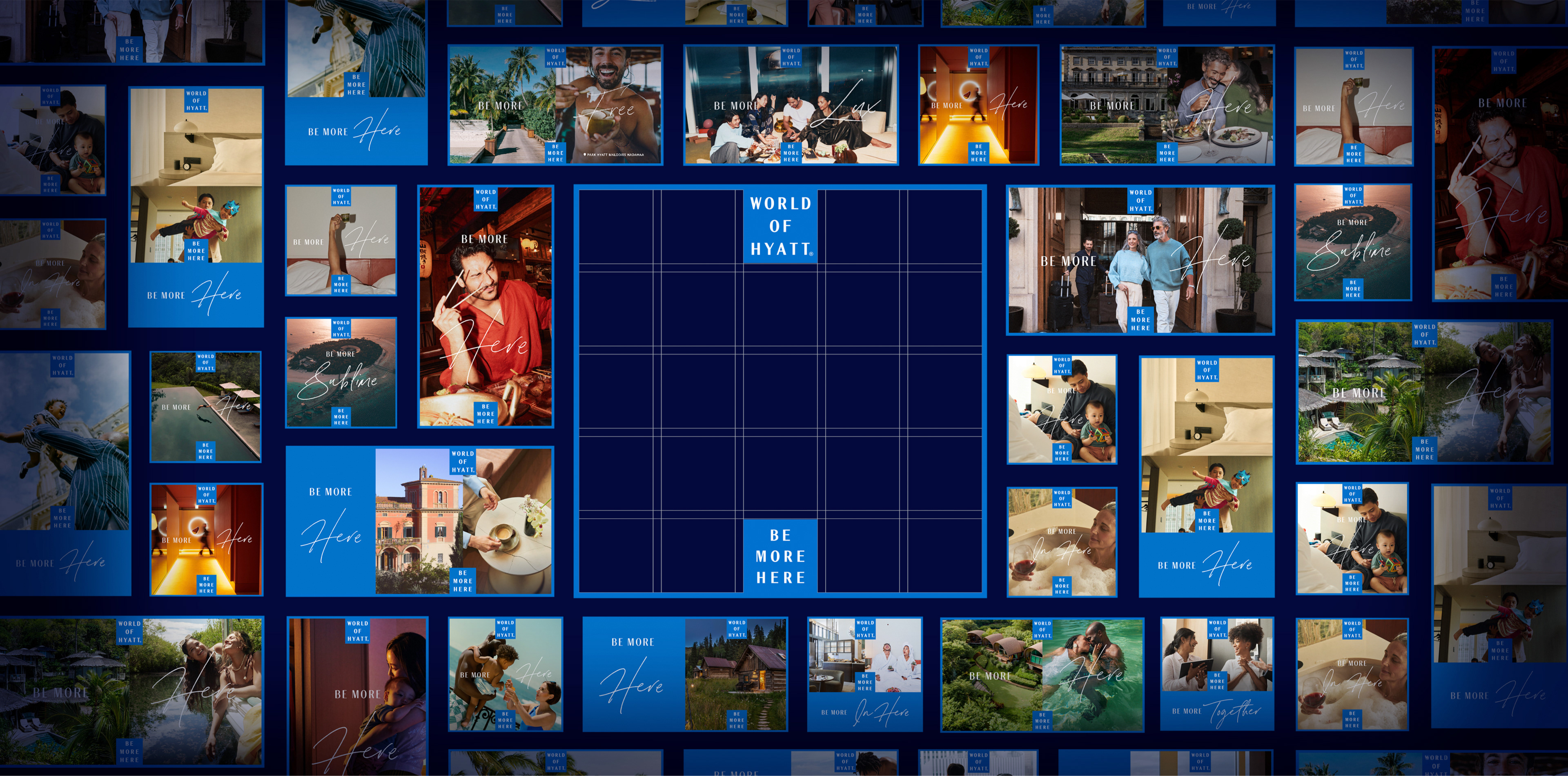 The team evolved the graphic blue square logo by mirroring it with the new Be More Here tagline to create a subtle, hidden “H”, resembling a window into the World of Hyatt. This H-frame is displayed on all media types––instagram posts, email headers, website heroes, billboards, on-property marketing materials, etc.