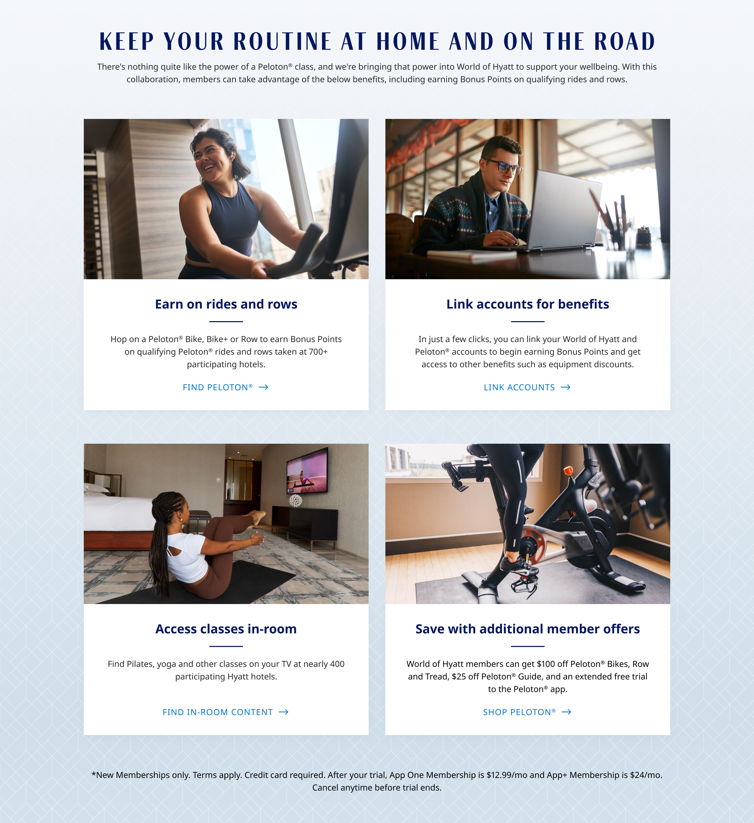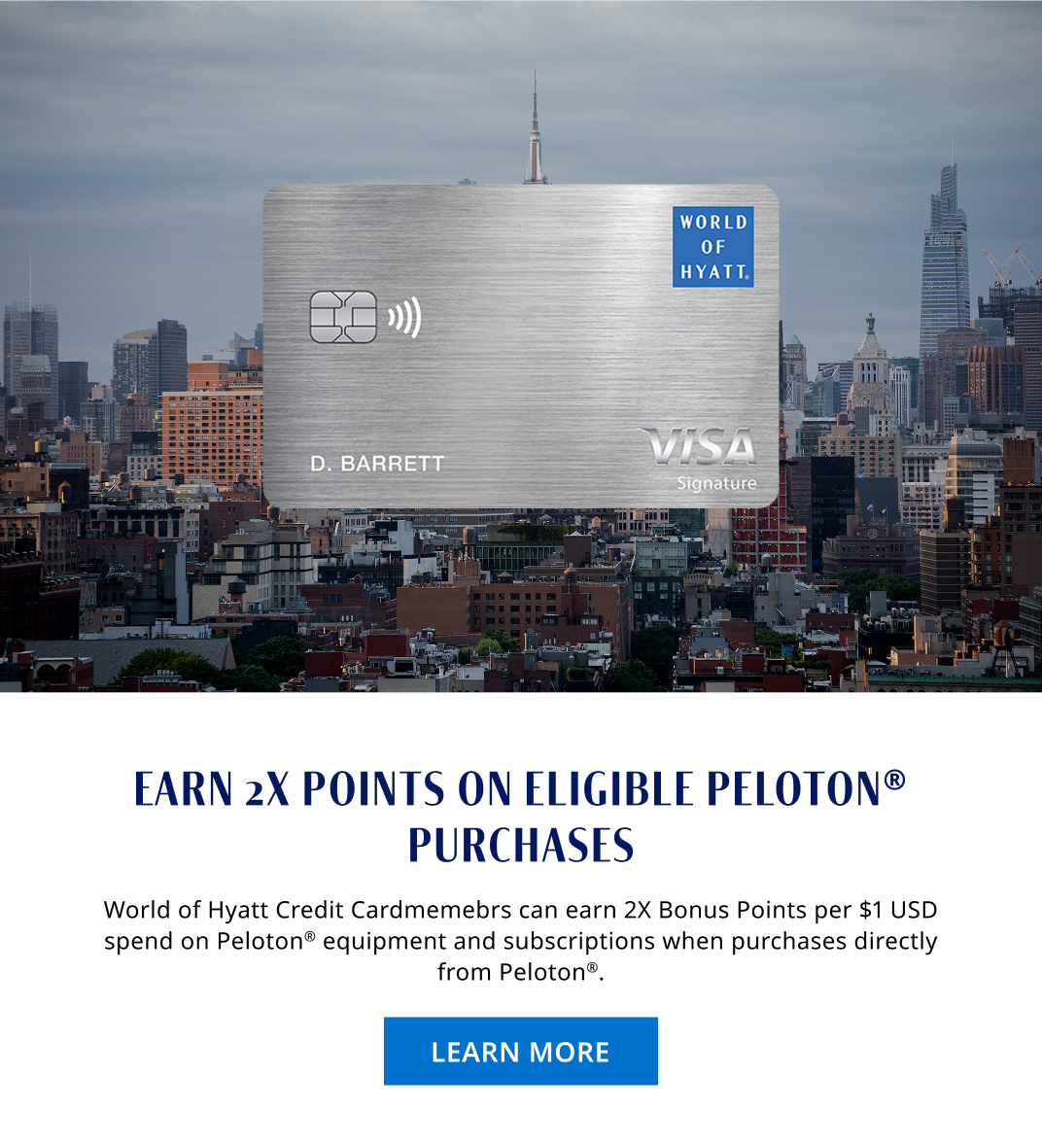 World of Hyatt teamed up with Peloton® to reward its members to earn 100 Bonus Points per workout, up to 1,000 points per month when they link accounts and complete a ride or row of at least 20 minutes. The collaboration outfits 800+ Hyatt properties with Peloton equipment and provides access to Peloton classes on guestroom TVs at nearly 400 properties for guest and member enjoyment.