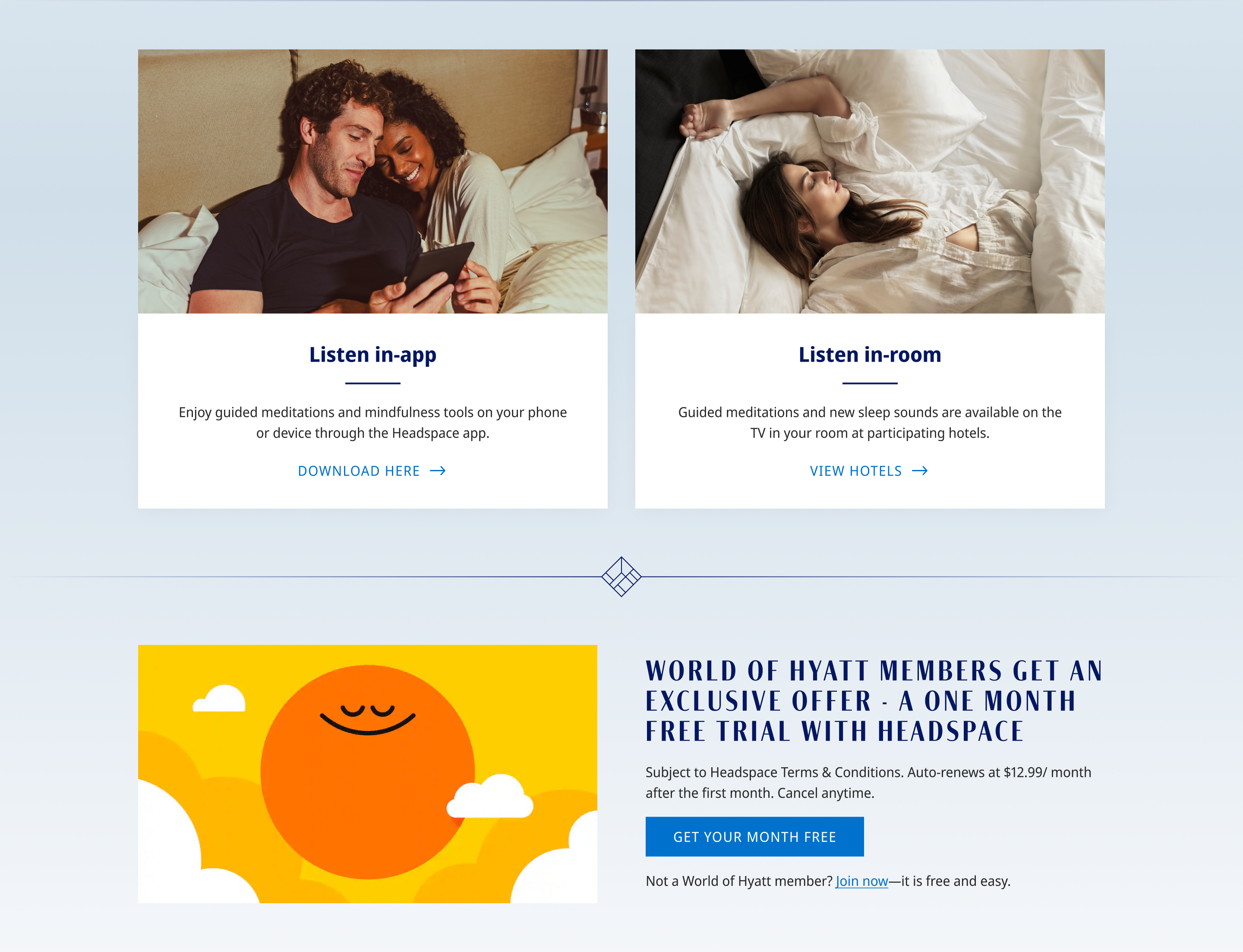 Guests receive complimentary access to Headspace via in-room content, including short meditations for those with busy schedules, soothing sounds for a restful night’s sleep, expert guidance from former monk and Headspace co-founder Andy Puddicombe, and more.